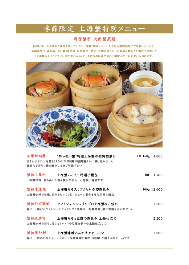 JASMINEでは毎年ご好評を頂いている“上海蟹”特別メニューを今秋も期間限定でご用意いたします。
